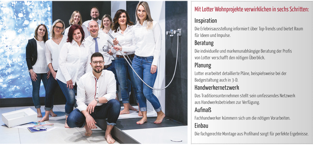 Ob es um die Frisur geht, den Turnschuh oder das Nutella mit persönlicher Widmung und einem Gruß – Individualisierung ist in unserem Alltag angekommen, und das ist auch gut so. Wir möchten unsere Persönlichkeit in unserem Lebensumfeld wiederfinden und sind nicht mit „das hat man so“ zu­frieden, denn die persönliche Entfaltung eines jeden Menschen ist ein Trend in unserer heutigen Zeit. Lotter macht diesen Trend zu seinem Anspruch: Die Badspezialisten inspirieren, beraten und planen, gerne auch gemeinsam mit Ihrem Fachhandwerker. Wir begleiten den Weg zu Ihrem neuen Bad von der ersten Objektbesichtigung bis zum letzten Handtuchhaken – mit Kompetenz und Kreativität, einem riesigen Sortiment führender Marken und viel Liebe zum Detail. Egal, ob es die auf die Bedürfnisse und Größe angepasste Dusche ist, die Waschtisch­lösung, die auf den Raum zugeschnitten ist, oder der Spiegel mit dem richtigen Licht für jede Lebenslage, wir bieten Ihnen in unserer Bädergalerie für jeden Raum die optimale, individuelle Lösung. Bei Lotter können Sie das Bad der Zukunft erleben!