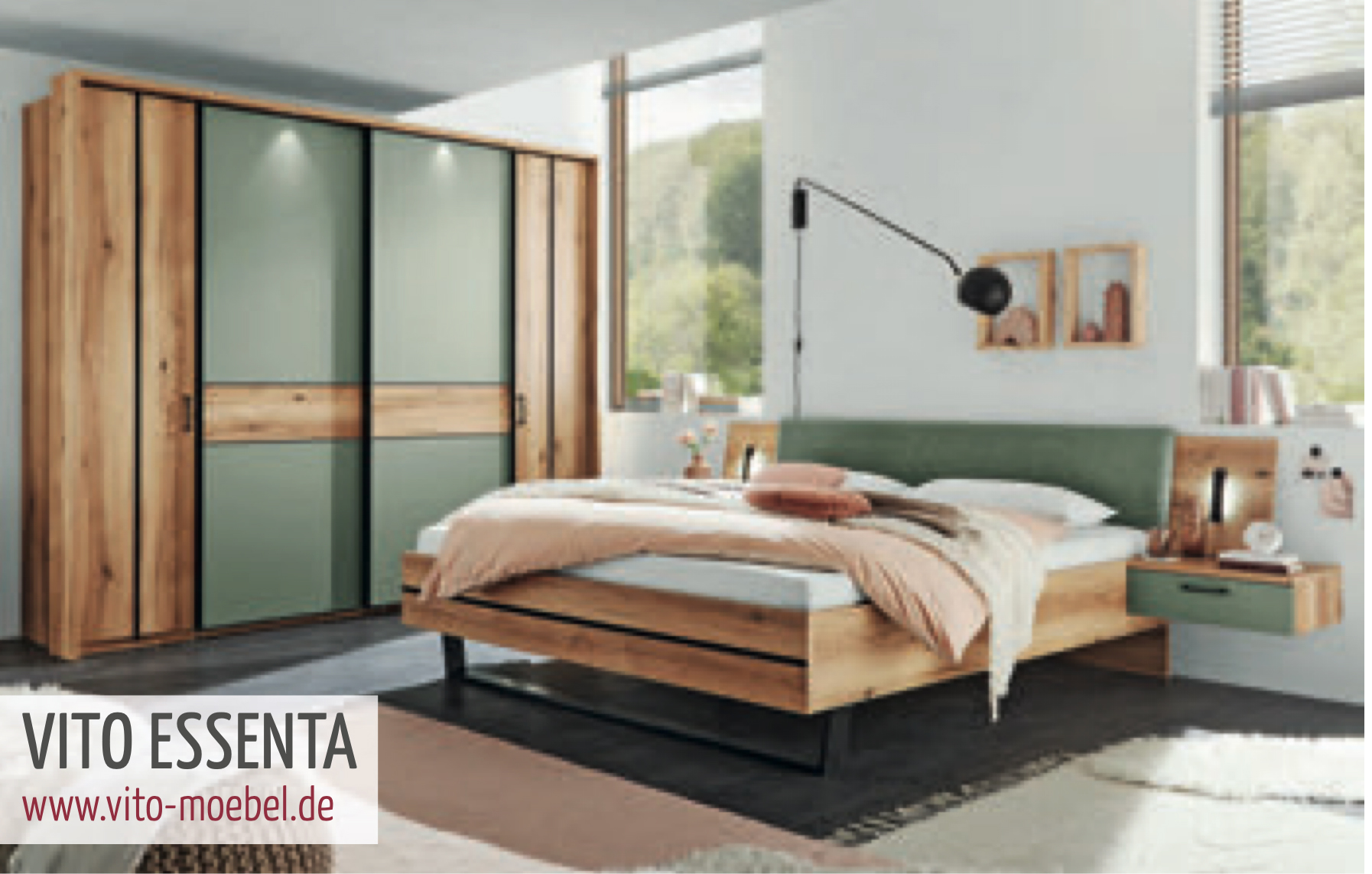 VITO ESSENTA vereint funktionale Ausstattung und moderne Gestaltung zu einem stilvollen Schlafzimmer. Die Kombination aus natürlicher Holzoptik und sanftem Farbton