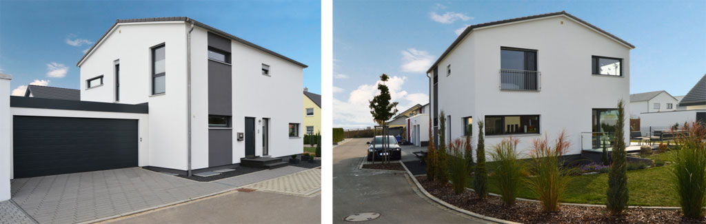 Die Bauherren suchten ein geeignetes Grundstück in der Nähe von Familie und Freunden – kein leichtes Unterfangen, denn das bedeutet nahe bei Ulm, wo Bauplätze rar sind. Doch das Paar hatte Glück. Ein bereits reserviertes Grundstück im Neubaugebiet von Weiden­stetten kam wieder auf den Markt. Da es perfekt für ihr Vorhaben war, kauften sie es unverzüglich. Zeitgleich zur Grundstücks­suche informierten sie sich über den Hausbau. Sie besuchten Infotage, besichtigten Rohbauten und sahen sich die Musterhäuser im HausBau Center Ulm an, wo man eine moderne Stadtvilla mit großen Fensterfonten von Lehner Haus besichtigen kann. Da den zukünftigen Bauherren das Musterhaus zusagte und ihnen Lehner Haus von Freunden und Bekannten empfohlen wurde, fiel die ­Entscheidung leicht.