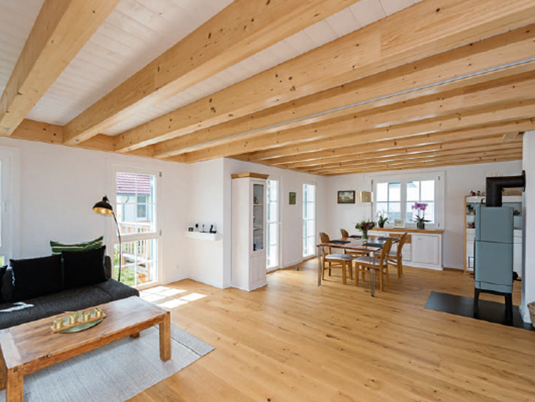 Im Innenbereich sind die massiven Holzwandelemente teils sichtbar, teils mit Gipsplatten verkleidet und verputzt. Die Decke besteht aus einer sichtbaren Holzbalkendecke. Das familienfreundliche Haus ist voll unterkellert (Betonfertigteilkeller). Im Erdgeschoss befinden sich die Küche, ein großzügiger Wohn-Essbereich, ein praktischer Abstellraum sowie das Gäste-WC, das in diesem Fall mit einer Dusche ausgestattet ist. Das Einfamilienhaus mit Charakter überzeugt durch seine nachhaltige Bauweise. Der Dachstuhl des Studios wurde in echter Zimmermannsqualität ausgeführt. Diffusionsoffen – mit sichtbaren Sparren und hochwertiger Aufdachdämmung aus Holzfaserplatten. Wärmequelle für Warmwasser und Heizung ist eine Luft-Wasser-Wärmepumpe. Die Wärme abgabe im Erdgeschoss und Dachgeschoss erfolgt über eine Fußbodenheizung. Auf eine technische Lüftungsanlage wurde verzichtet, da die gesamte Gebäudehülle diffusionsoffen ist. Alle Wände sind folien frei! Nicht umsonst heißt es bei Rems-Murr-Holzhaus: Wir bauen Häuser zum Aufatmen. Das Haus erfüllt die Anforderungender KFW 55 und ist dementsprechend