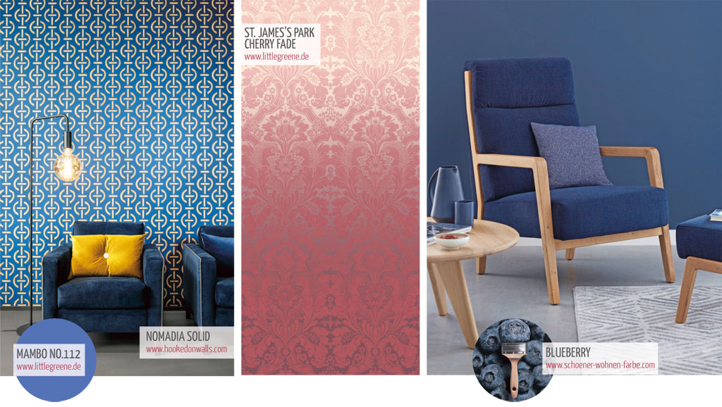 Wie frisch und modern edle Damastmuster wirken können, zeigt die Tapete „St. James’s Park“ in Cherry Fade, einem fruchtigen Kirschrot im Ombré-Effekt, der nach oben immer heller wird (www.littlegreene.de, Bild unten Mitte). Die Lieblingsfarbe der meisten Deutsche ist nach wie vor Blau. Momentan aber gerne fruchtig und fröhlich, wie „Blueberry“, das dank des hohen Schwarzanteils edel und gemütlich wirkt (Bild rechts unten, www.schoener-­wohnen-farbe.de). Oder „Mambo“ das mit seiner Intensität gute Laune verbreitet, wie der gleichnamige Tanz (Bild links unten). Kräftiges Blau dient auch dem Kettengliederprint im Ethno-Look als Basis, „Nomadia Solid“, (Bild links unten, www.hookedonwalls.com).