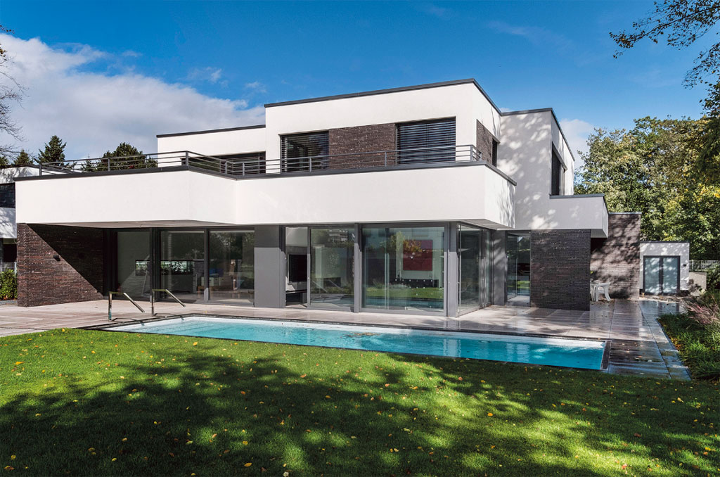 drei Bekenntnisse der ambitionierten Planerin kennen: Die Reverenz an kubische Architektur im Stile des Bauhauses, die innere Überzeugung für gebrannten Ton und der Respekt vor dem Detail. All das konnte die Architektin beim Auftrag für ein fast 400 Quadratmeter großes, repräsentatives Anwesen in Oberhausen mit dem Gespür für Material und Farbe sowie der nötigen Erfahrung in einmaliger Weise zusammenführen. Das baumbestandene Grundstück in einer stillen Stichstraße eröffnete den nötigen Gestaltungsraum mit immerhin fast 1.500 Quadratmetern parkähnlicher Fläche.