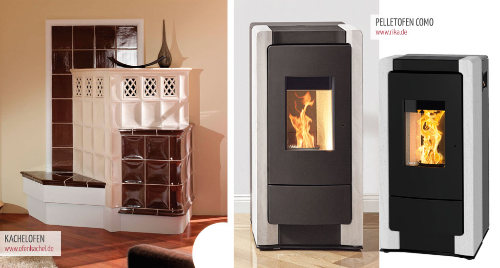 „COMO“ ist ein raumluftunabhängiger Pelletofen, ein Meilenstein funktioneller Architektur und wahrscheinlich der leiseste Pelletofen am Markt. Er integriert sich in die Architektur und verschmilzt auf diese Weise mit seiner Umgebung (Bilder oben rechts, www.rika.de). Kachelöfen werden vom Ofenbauer errichtet und individuell an das Wohnumfeld angepasst. Die Kacheln sind nicht nur dekorative Elemente, sondern erhöhen als keramische Ummantelung die Wärmespeicherfähigkeit des Ofens (www.ofenkachel.de, Bild oben links). Bei diesen Öfen wird zwischen dem Grundofen, Warmluftkachelofen und Kombilösungen unterschieden. Der Grundofen ist massiv gemauert, wobei teilweise über eine Tonne keramisches Speichermaterial verwendet wird. Die Holzscheite werden direkt auf dem Grund des Feuerraumes verbrannt. Durch seine hohe Speichermasse kann er die Wärme bis zu 24 Stunden lang halten. Der Warmluftkachelofen ist die moderne Variante, da er schneller aufheizt und schon nach kurzer Zeit Wärme spendet. Im Inneren befindet sich ein industriell gefertigter Heizeinsatz aus Stahl oder Gusseisen. In Verbindung mit metallischen Nachheizflächen sorgt er für schnelle oder mit einem keramischen Speicher für besonders langanhaltende Wärme. Wie der Warmluftkachelofen verfügt der Heizkamin über einen modernen Einsatz, der mit einer großen Sichtscheibe ausgestattet ist, sodass das Feuervergnügen im Mittelpunkt steht. Der Heizeinsatz sorgt fü̈r eine umweltgerechte Verbrennung, wenig Emissionen und einen geringen Wärmeverlust. Zudem kann er wie der Warmluftkachelofen mit Nachheizflächen kombiniert werden. Während Kamin- und Pelletöfen freistehende Einzelfeuerungen sind und schnell auf- und abgebaut werden können, handelt es sich bei Heizkaminen und Kachelöfen um individuell gestaltete Anlagen, die vom Ofenbauer in Handarbeit gesetzt werden.